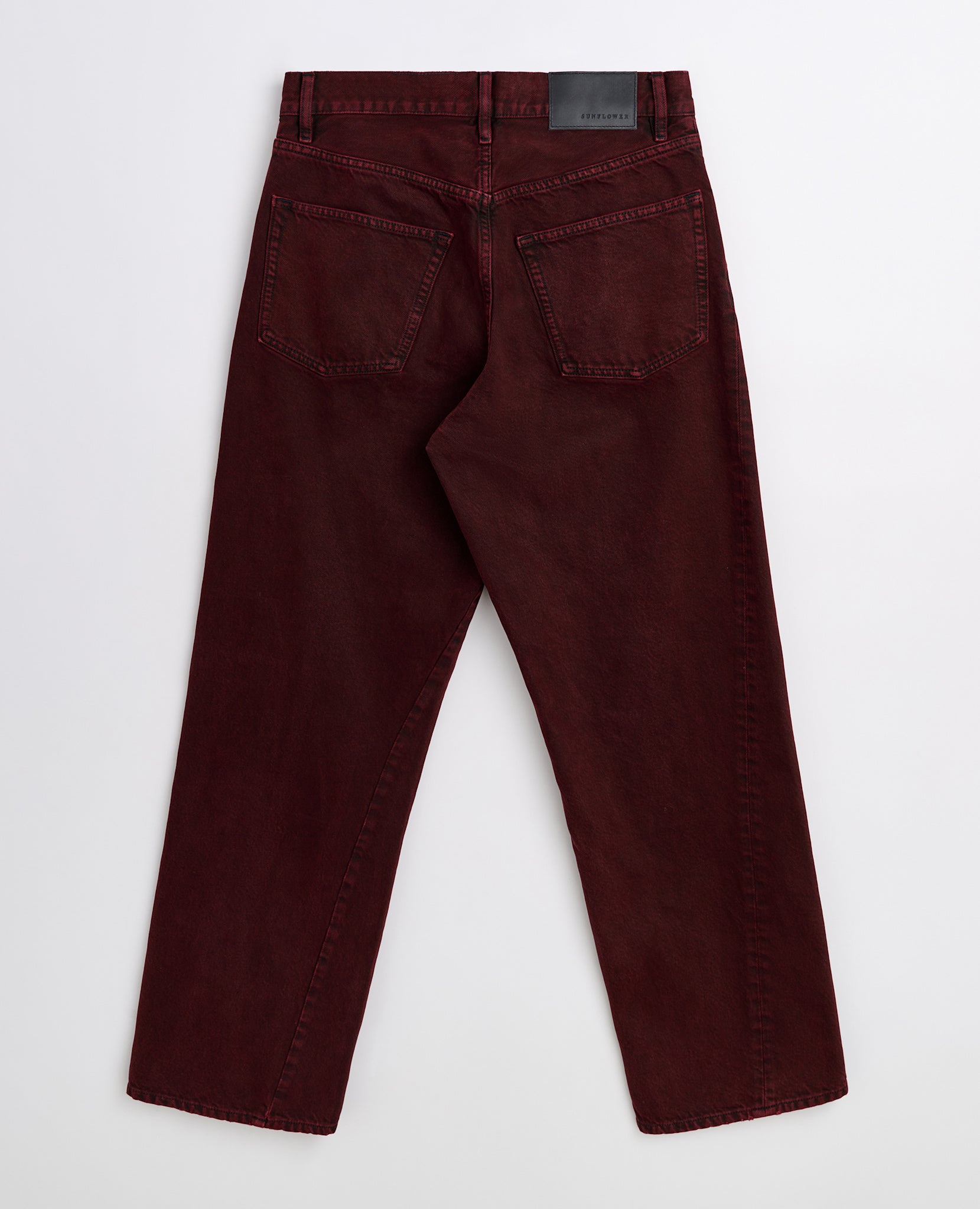 Wide fit jeans, garment is dyed to dark wine red overdye and then heavily washed for the worn-in feel.