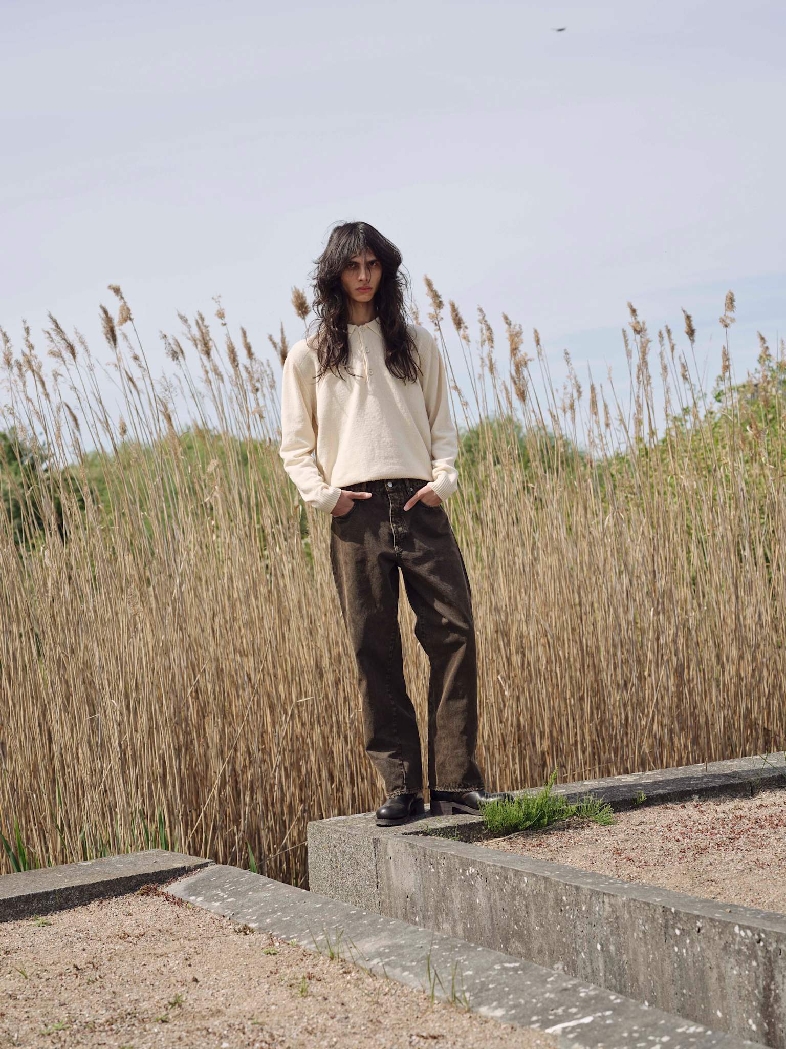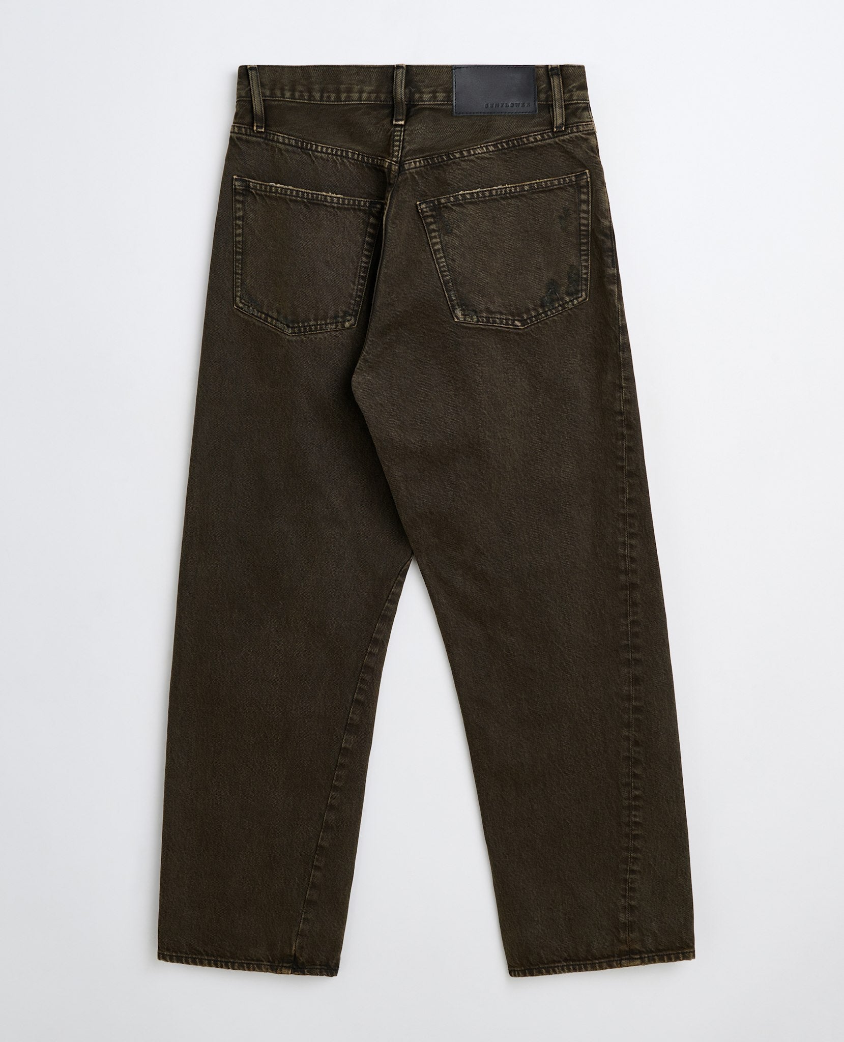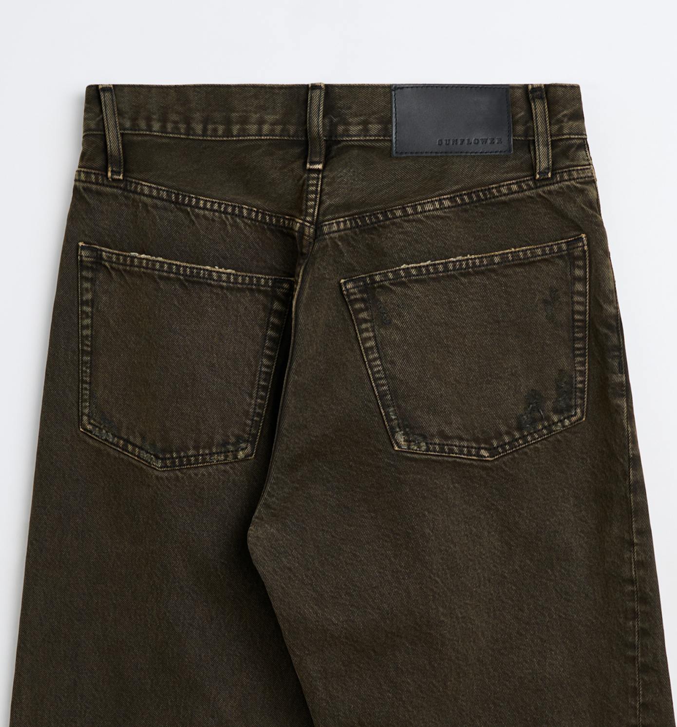 Wider fitted 5 pocket with twisted side seams in a dark over-dye.